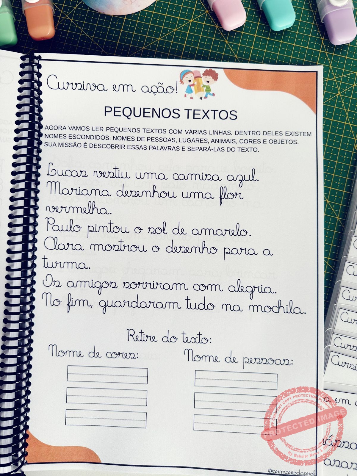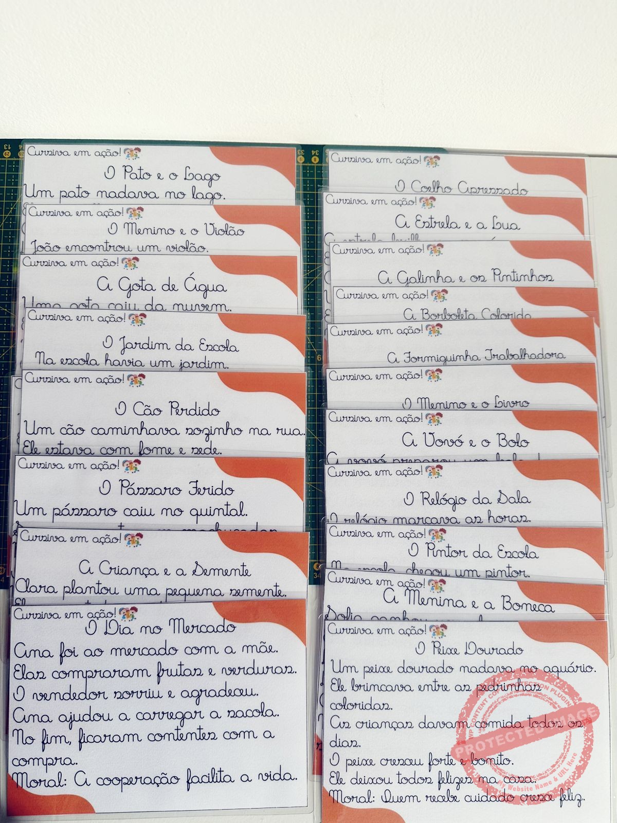 ✨ Bloco 5 – Fichas de leitura: 20 pequenos textos em cursiva para treinar leitura, compreensão e fluidez.