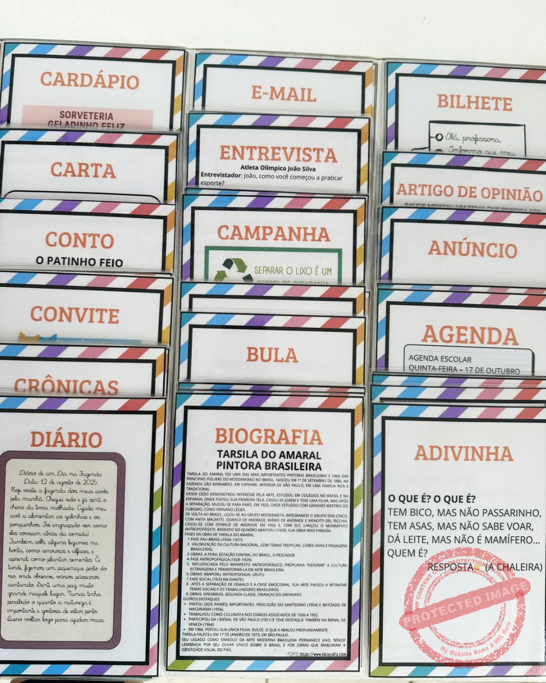 📚 Gêneros (34): Adivinha • Agenda • Anúncio • Artigo de Opinião • Bilhete • Biografia • Bula de Medicamento • Campanha de Conscientização • Cardápio • Carta Pessoal • Conto • Convite • Crônica • Diário • E-mail • Entrevista • Fábula • Ficha Técnica • História em Quadrinhos • Texto Informativo • Legenda • Lenda • Lista • Mito • Notícia • Parlenda • Piada e Anedota • Poema • Quadrinha • Receita • Regras de Jogos e Brincadeiras • Trava-língua • Sinopse • Verbete