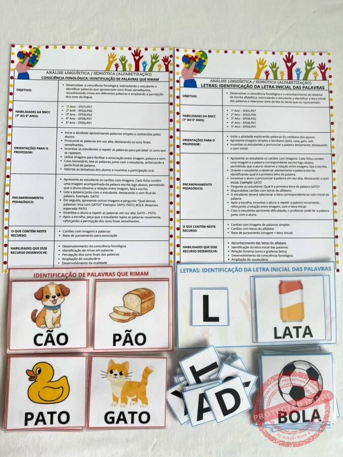 ANÁLISE LINGUÍSTICA / SEMIÓTICA ✅Letra inicial das palavras(1 base, 16 figuras, 26 letras do alfabeto) ✅Consciência fonológica – rimas (1 base, 16 figuras) ✅Formação e leitura de sílabas(1 base, 110 sílabas, 20 imagens, 20 palavras)